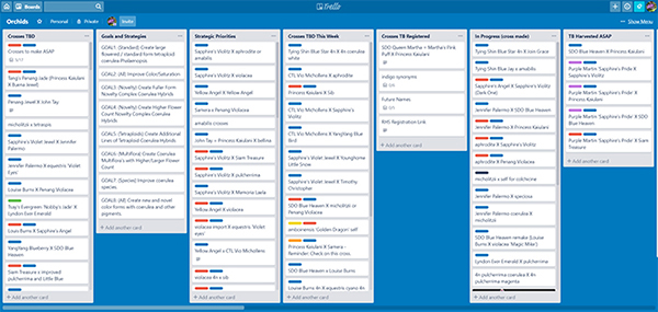 It easily allows me to organize crosses by priority, keep up with crosses that I need to make in the current week and crosses that need attention in the lab.  This really helps with staying focused as I can prioritize crosses and use prioritized lists to determine which crosses I'm going to make next.  I can then also use that prioritization to determine which crosses in the lab I really need to put more time and energy into.   I still use a database to keep track of all my crosses, but so far that database has not been integral to the pre-planning stages.  In the future I still may develop a module for my database that facilitates cross planning, but tools I am currently using work as they are so it's a lower priority.  Prior to ever putting anything in Trello I often work through multi-generation lines of breeding on paper that are related to different strategies that I believe will help achieve specific breeding goals.  So my workflow has become this:
